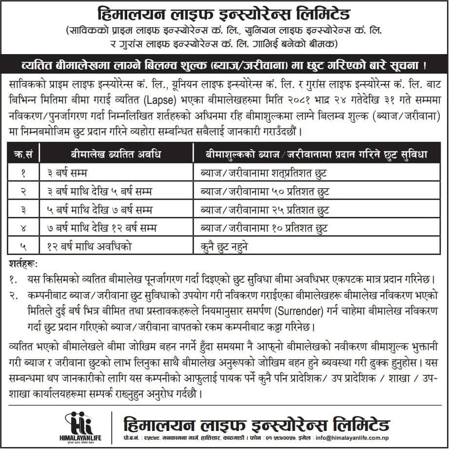हिमालयन लाइफको बीमालेख नवीकरणमा शत प्रतिशतसम्म छूूट