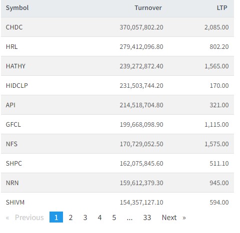 त्यस्तै, हिमालयन रि, हाथवे, हाईड्रो इलेक्टिसिटी, अपी पावर, गुडबिल फाइनान्स, नेपाल फाइनान्स, सानिमा माई, सानिमा माई, एनआरएन इन्फ्रास्क्चर र शिवम सिमेन्टसको सर्वाधिक कारोबार रहेको छ।