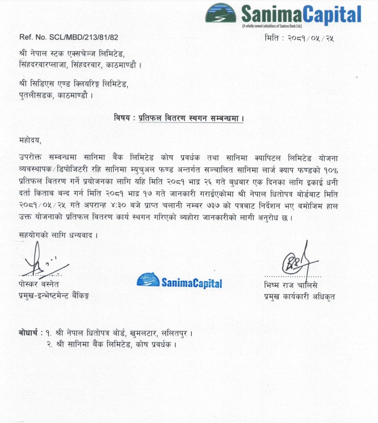 नेपाल धितोपत्र बोर्डको निर्देशन अनुसार उक्त लाभांश वितरण हाललाई स्थगित गरिएको सानिमा क्यापिटलले नेप्सेमार्फत जानकारी दिएको छ ।