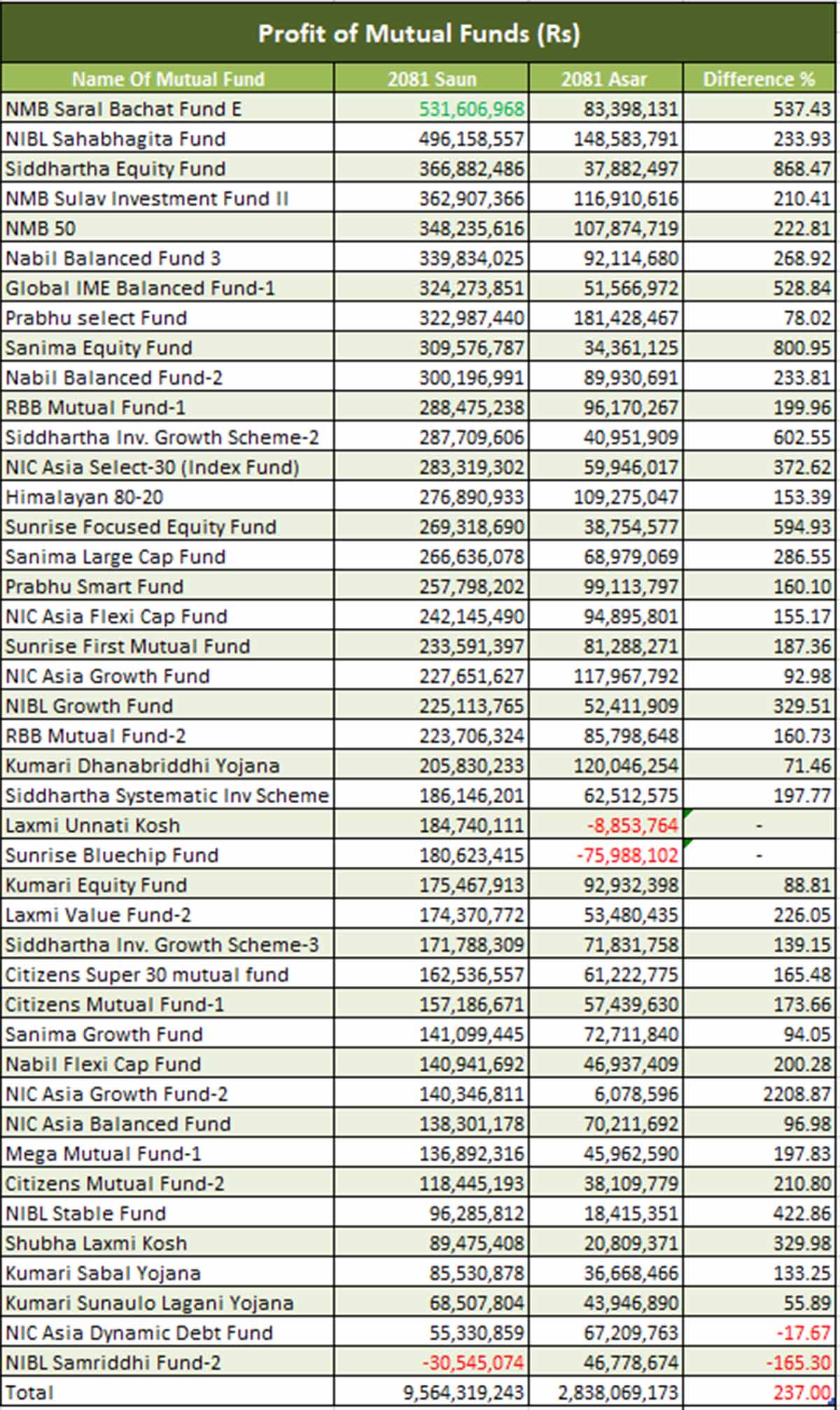 सर्वाधिक नाफा एनएमबि सरल बचत फन्ड–ई ले कमाएको छ, जसले ५३ करोड १६ लाख रुपैयाँ नाफा कमाएको छ। यो असारको तुलनामा ५३७.४३ प्रतिशतको बृद्धि हो । यस्तै, एनआईबीएल सहभागिता फन्डले ४९ करोड ६१ लाख ५८ हजार, सिद्धार्थ इक्विटी फन्डले ३६ करोड ६८ लाख, एनएमबि सुलभ इन्भेष्टमेन्ट फन्ड–दोस्रोले ३६ करोड २९ लाख, एनएमबि ५० ले ३४ करोड ८२ लाख, नबिल ब्यालेन्ड फन्ड–३ ले ३३ करोड ९८ लाख, ग्लोबल आइएमई ब्यालेन्ड फन्ड–१ ले ३२ करोड ४२ लाख, प्रभु सेलेक्ट फन्डले ३२ करोड ९८ लाख, र नबिल ब्यालेन्ड फन्ड–२ ले ३० करोड रुपैयाँ नाफा कमाएका छन्।