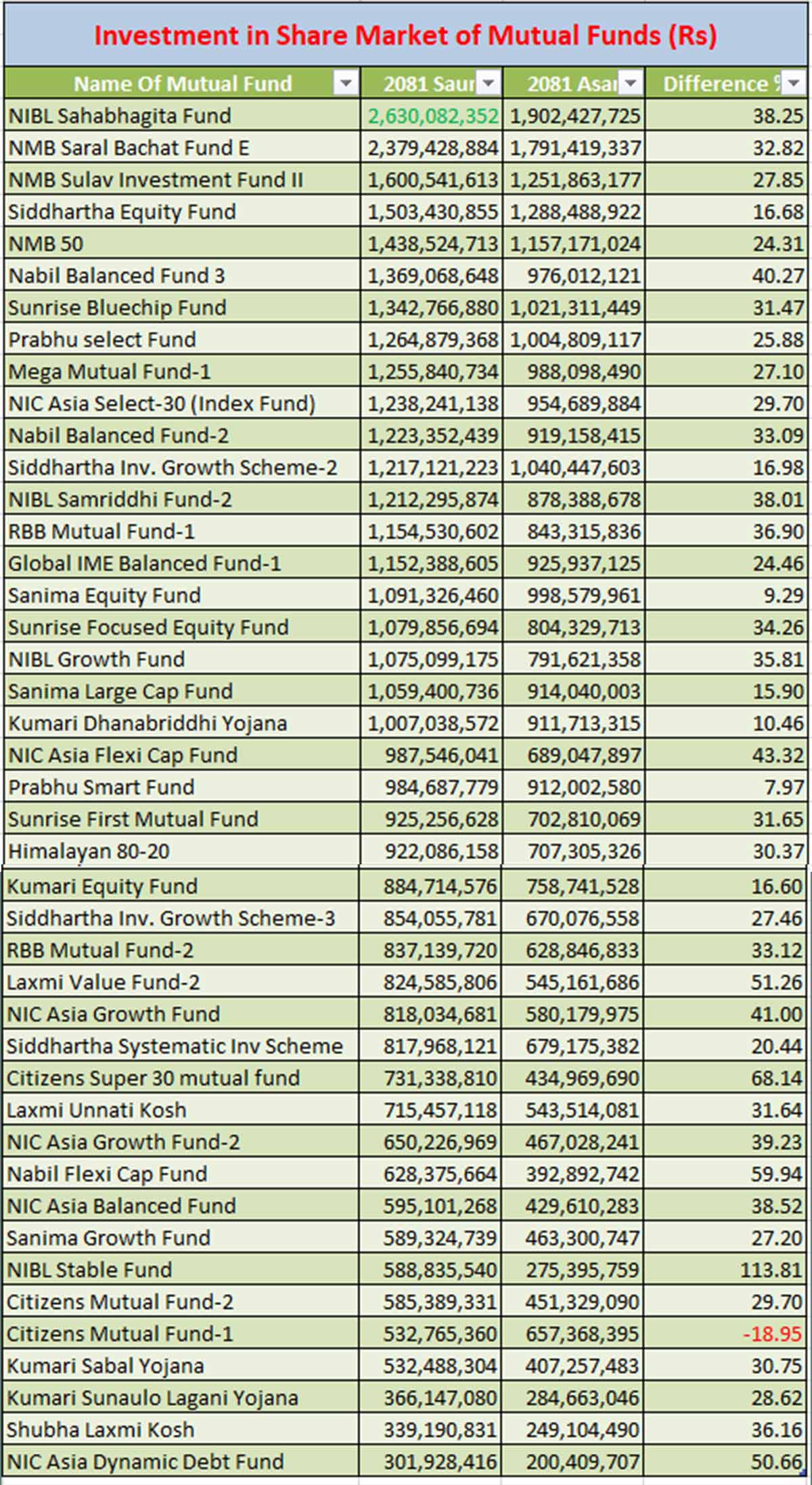 साउन महिनामा, म्युचुअल फन्डहरूले कुल ९ अर्ब ८१ करोड ३८ लाख रुपैयाँको अतिरिक्त लगानी गरेका छन्। सिटीजन म्युचुअल फन्ड–१ बाहेक, सबै म्युचुअल फन्डहरूले लगानीमा वृद्धि देखाएका छन्। सिटीजन म्युचुअल फन्ड–१ को लगानीमा मात्र कमी आएको छ, अन्य ४२ वटा फन्डहरूले आफ्नो लगानी बढाएका छन्।