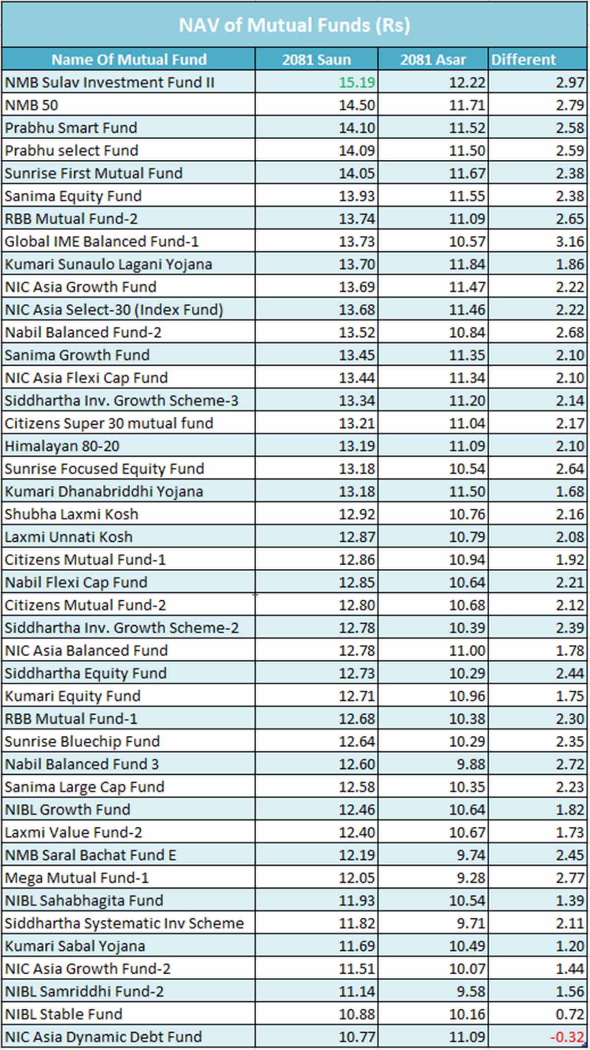 म्युचुअल फन्डहरूको न्याभमा उल्लेखनीय वृद्धि देखिएको छ। यस महिनामा धेरै फन्डहरूको न्याभ बढेर नयाँ उचाइमा पुगेको हो । सर्वाधिक वृद्धि एनएमबि सुलभ इन्भेष्टमेन्ट फन्ड–दोस्रोको न्याभ मा भएको छ, जसले १५.१९ रुपैयाँको न्यभा मा पुगेको छ । यो गत असारको तुलनामा २.९७ रुपैयाँले वृद्धि भएको हो ।