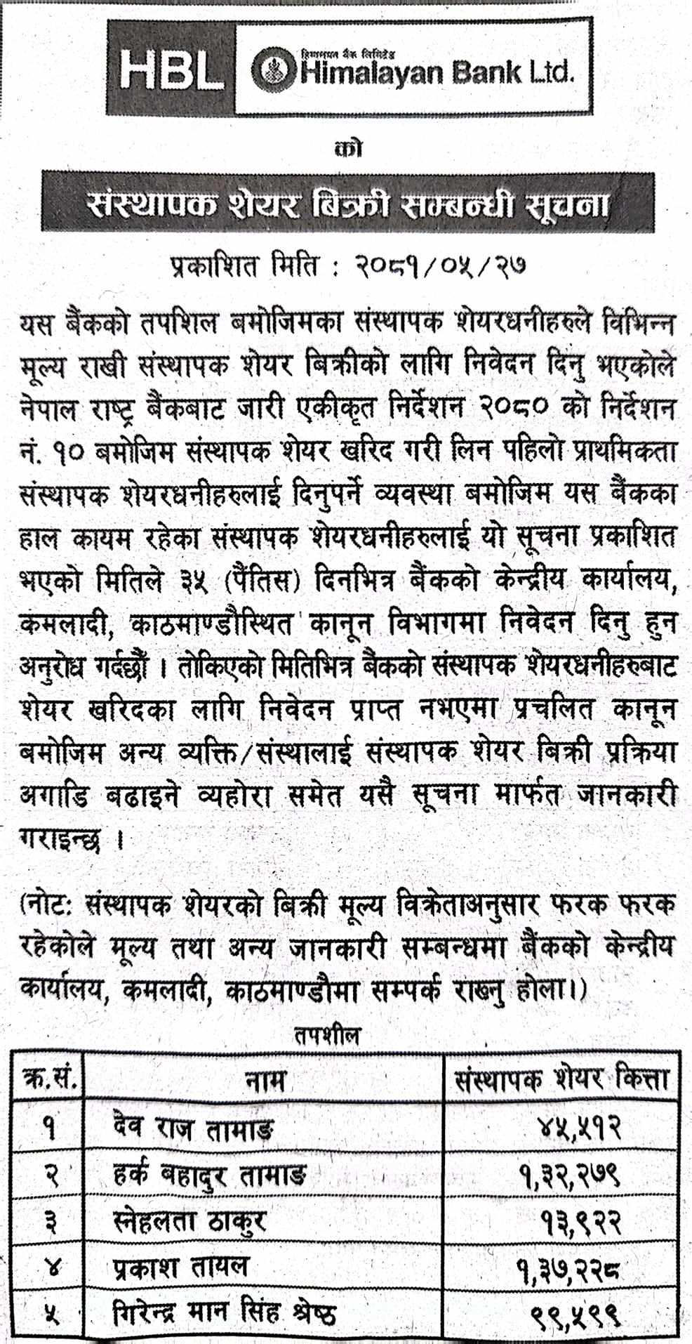 काठमाडौं । हिमालयन बैंक लिमिटेडले संस्थापक शेयर बिक्रीमा राखेको छ । बैंकले ५ जना संस्थापक शेयरधनीहरूको नाममा रहेको ४ लाख २८ हजार ५४० कित्ता शेयर बिक्रीमा राखेको हो ।