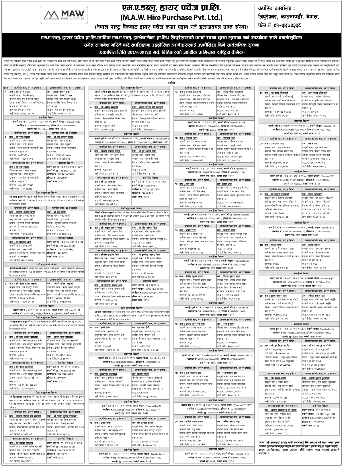 एमएडब्लु हायर पर्चेज प्रालिद्वारा यी ऋणीहरुलाई कर्जा चुक्ता गर्न आग्रह