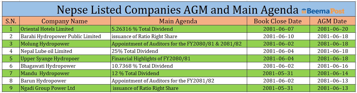 सूचीकृत कम्पनीहरुमध्ये ओरियण्टल होटल लिमिटेड, नेपाल ल्यूब आयल लिमिटेड र ७ वटा हाइड्रोपावरहरुले नेपालीहरुको महान चाँडपर्वको रुपमा रहेको विजयाँ दशमी भन्दा अगाडी नै वार्षिक साधारण सभा सम्पन्न गर्ने निर्णय गरेका छन् ।