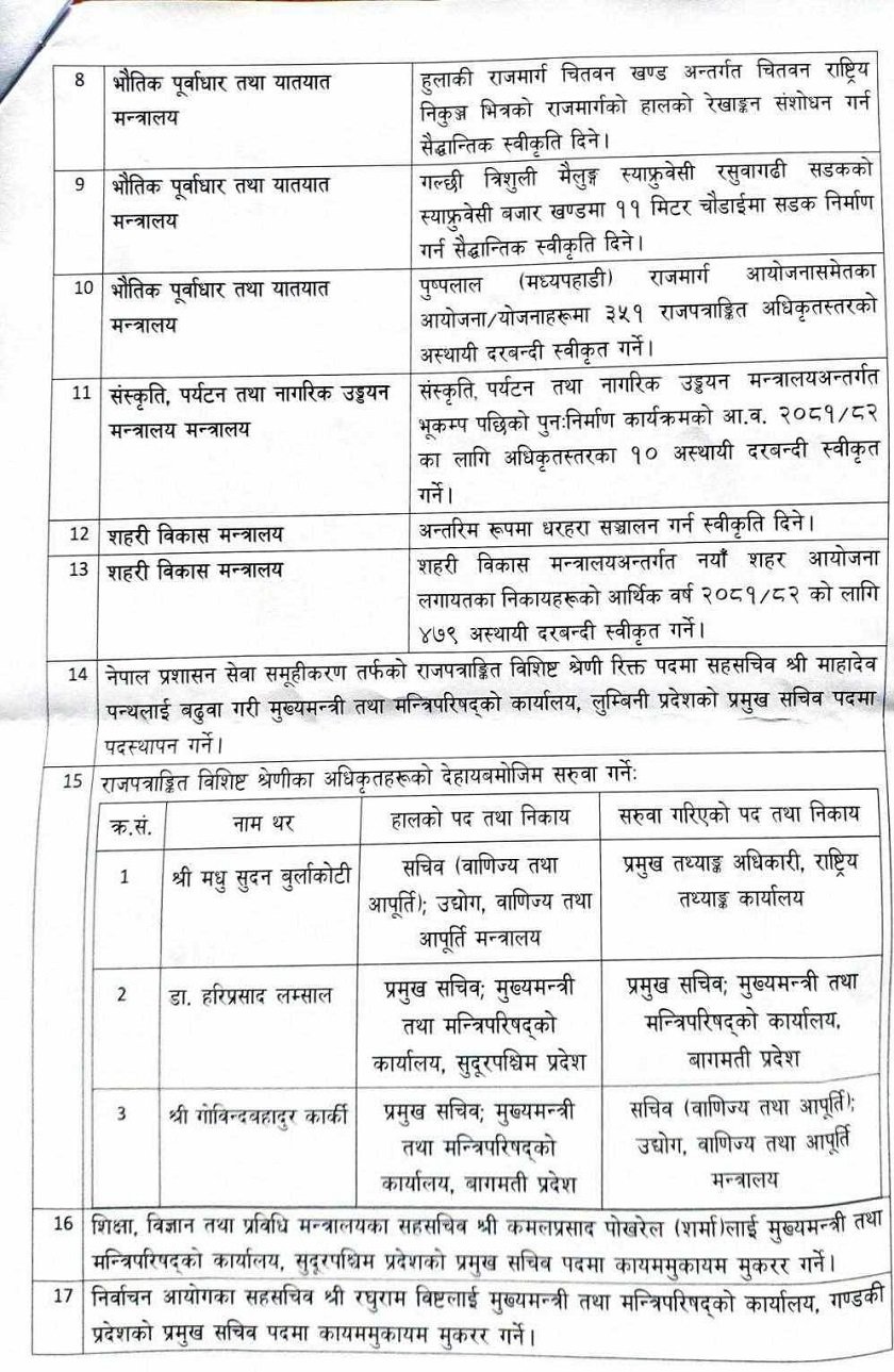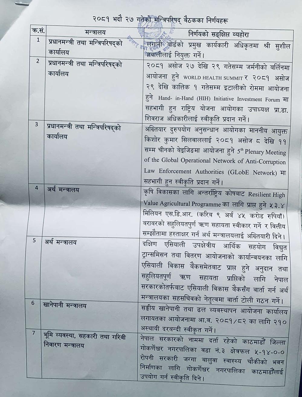 बैठकले सुशील ज्ञवालीलाई लगानी बोर्डको प्रमुख कार्यकारी अधिकृतमा नियुक्त गर्ने निर्णय गरको छ भने मन्त्रिपरिषद्को बैठकले अन्तरिम रुपमा धरहरा संचालनको अनुमति दिने निर्णय गरेको छ ।