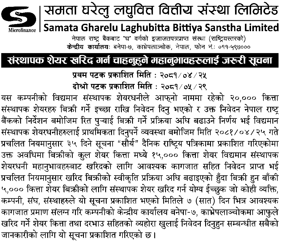 समता घरेलु लघुवित्तको शेयर बिक्रीमा, सर्वसाधारणले किन्न पाउने