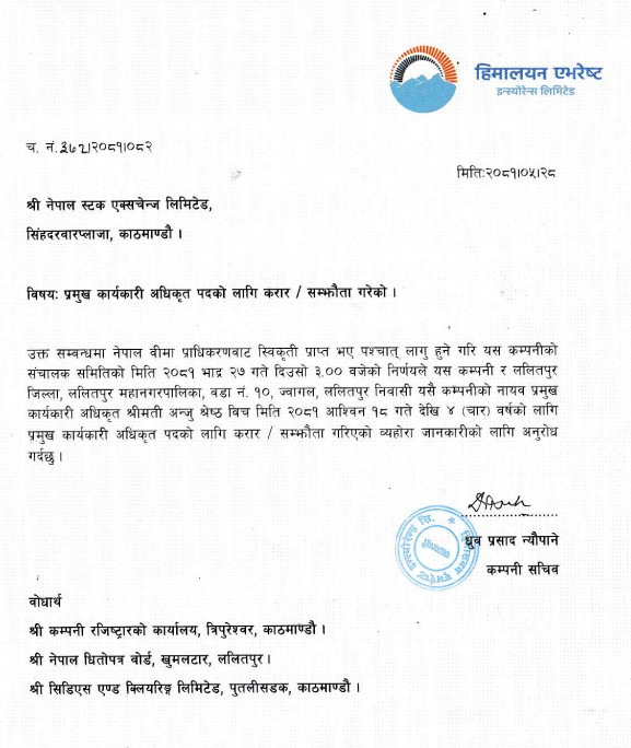 कम्पनीको भदौ २७ गते बसेको सञ्चालक समितिको बैठकले हिमालयन एभरेष्ट इन्स्योरेन्स कम्पनी र सोही कम्पनीकी नायव प्रमुख कार्यकारी अधिकृत अन्जु श्रेष्ठबीच सीईओ पदका लागि करार सम्झौता गरिएको हो ।