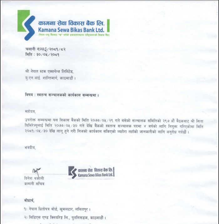 काठमाडौं । कामना सेवा विकास बैंक लिमिटेडको स्वतन्त्र सञ्चालकमा सिता घिमिरे नियुक्त भएकि छिन् । बैंकले उनीलाई आगामी चार वर्ष अवधिको लागि स्वतन्त्र सञ्चालकमा नियुक्त गरेको जनाएको छ ।