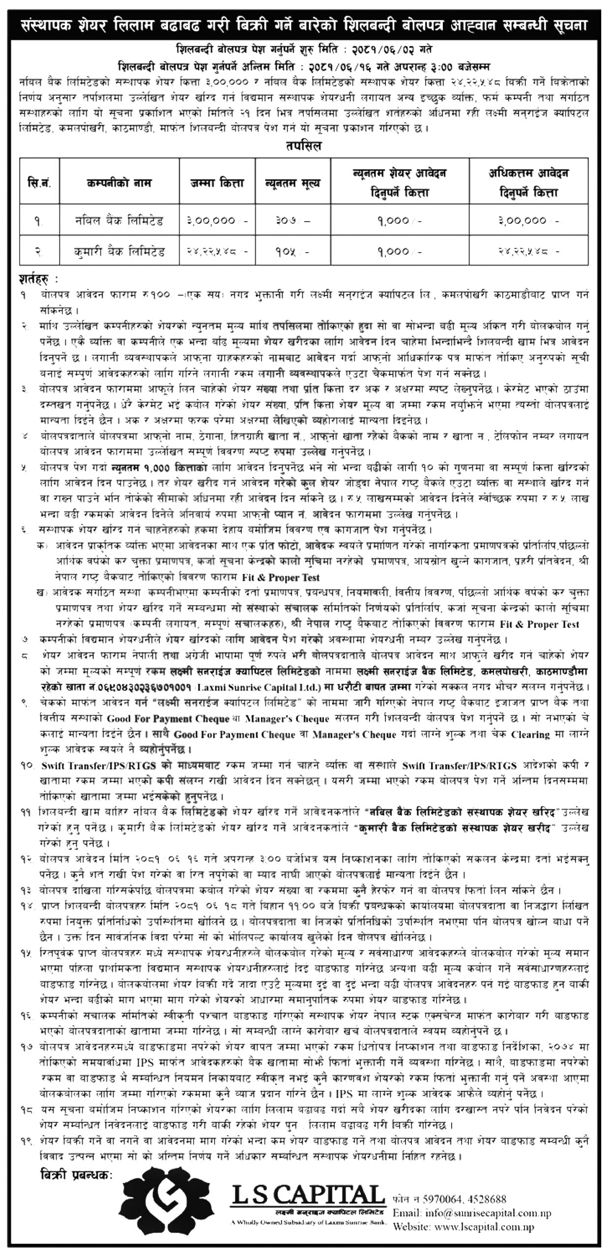 बैंकहरूले सो शेयर असोज २ गतेदेखि बिक्री खुला गर्ने जनाएका छन् । शेयर किन्न इच्छुक लगानीकर्ताहरूले तोकिएका शर्तको अधीनमा रही काठमाडौंको कमलपोखरीस्थित लक्ष्मी सनराईज क्यापिटल लिमिटेडमा गोप्य शिलबन्दी बोलपत्र पेश गर्नु पर्नेछ । बोलपत्र असोज १६ गते अपरान्ह ३ बजेसम्म पेश गर्न सकिनेछ ।