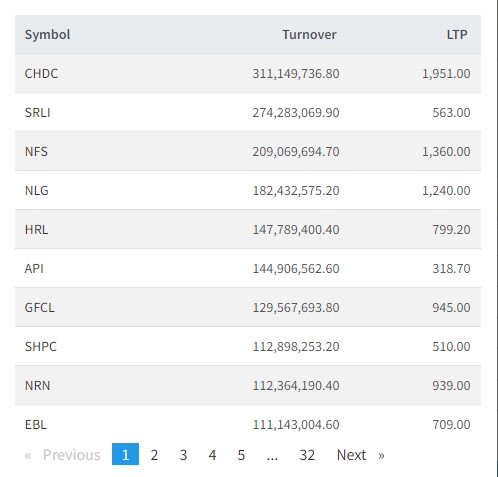 त्यस्तै, नेपाल फाइनान्स, एनएलजी इन्स्योरेन्स, हिमालयन रि, अपी पावर, गुडबिल फाइनान्स, सानिमा माई, एनआरएन इन्फ्रास्टक्चर, र एभरेष्ट बैंक आज सर्वाधिक कारोबार भएको छ ।