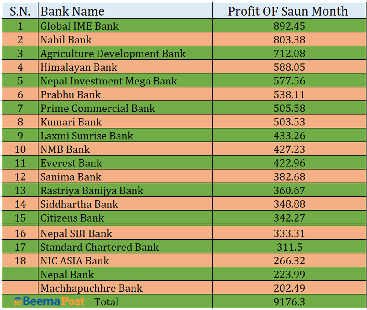 सार्वजनिक तथ्यांक अनुसार ग्लोबल आइएमई बैंक साउन महिनामा सबैभन्दा बढी नाफा आर्जन गर्ने बैंक बन्न सफल भएको छ । बैंकले साउन महिनामा ८९ करोड २० लाख रुपैयाँ नाफा गरेको छ ।