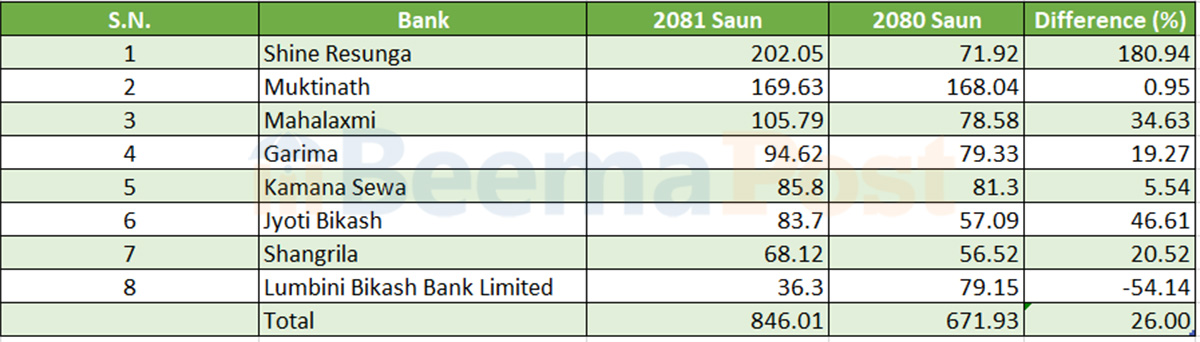 विकास बैंकको नाफा २६% ले बढ्योः शाइन आक्रामक-मुक्तिनाथलाई पछ्याउँदै महालक्ष्मी र गरिमा, पुच्छरमा लुम्बिनी