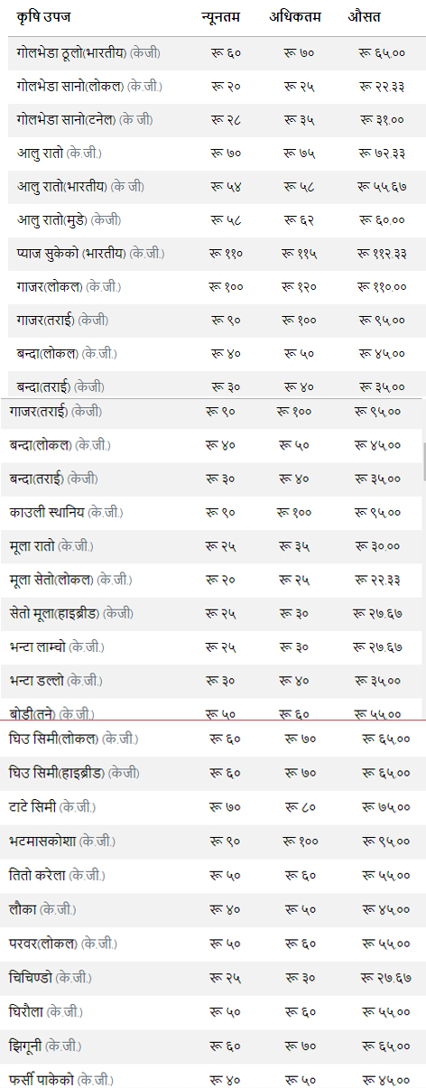 त्यसैगरी यस दिन रातो आलुको न्यूनतम् मूल्य ७० रुपैयाँ, प्याज ११० रुपैयाँ, गाजर र स्थानीय काउली ९० रुपैयाँ, बन्दा लोकल ४० रुपैयाँ, भान्टा लाम्चो २५ रुपैयाँ, मकै ७० रुपैयाँ, टाटे सिमी ७० रुपैयाँले प्रतिकिलो न्यूनतम किनबेच भइरहेको समितिले जनाएको छ ।
