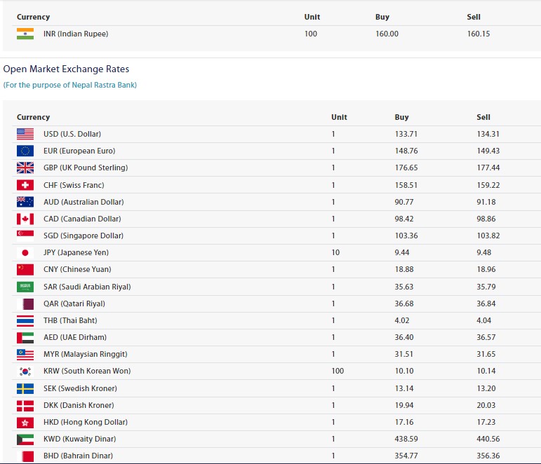 युरोपियन यूरो एकको खरिददर १४८ रुपैयाँ ७६ पैसा र बिक्रीदर १४९ रुपैयाँ ४३ पैसा निर्धारण गरिएको छ । केन्द्रीय बैंककानुसार युके पाउण्ड स्ट्रलिङ एकको खरिददर १७६ रुपैयाँ ६५ पैसा र बिक्रीदर १७७ रुपैयाँ ४४ पैसा रहेको छ ।