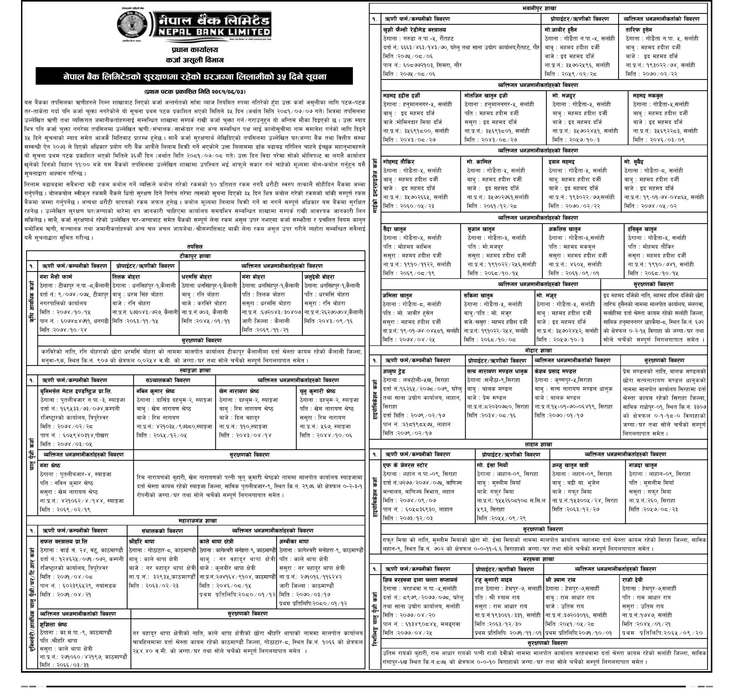 काठमाडौँ । नेपाल बैंक लिमिटेडले आफ्नो सुरक्षणमा रहेको घरजग्गा लिलामीको ३५ दिने सूचना जारी गरेको छ। यो सूचना पहिलो पटक २०८१ सालको ६ महिना ३ गते प्रकाशित भएको हो। बैंकका ऋणीहरूले नियमित रूपमा कर्जा र त्यसको ब्याज नतिरेको कारण कर्जा असुलीका लागि यो प्रक्रिया सुरु गरिएको हो।