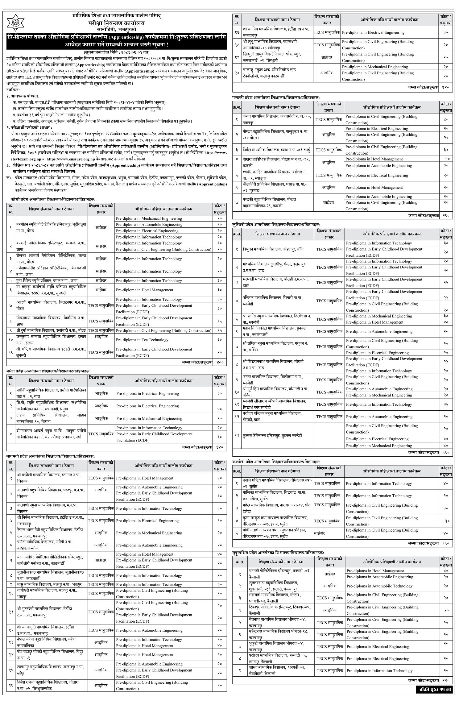 प्रि–डिप्लोमा तहको २४ महिना अवधिको निःशुल्क प्रशिक्षणका लागि आवेदन फाराम भर्ने आग्रह गरिएको छ । प्रशिक्षणमा सहभागी हुन एसईई वा एसएलसी परीक्षामा सहभागी भएको, प्रशिक्षणका लागि मानसिक र शारीरिक रूपमा सक्षम भएको र कम्तीमा १६ वर्ष पूरा भएको नेपाली नागरिक हुनुपर्ने सूचनामा उल्लेख छ ।