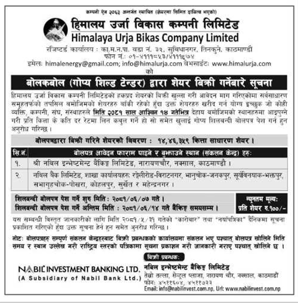 इच्छुक खरीदकर्ताले शेयर बिक्री खुलेपश्चात् बिक्री प्रबन्धक नबिल इन्भेष्टमेण्ट बैंकिङ्ग लिमिटेड वा नबिल बैंकका रङ्गेलीरोड, भानुचोक, सूर्यविनायक, सभागृहचोक, कोहलपुर, सुर्खेत र महेन्द्रनगर शाखा कार्यालयमा गोप्य शिलबन्दी बोलपत्र पेश गर्न सक्नेछन् ।