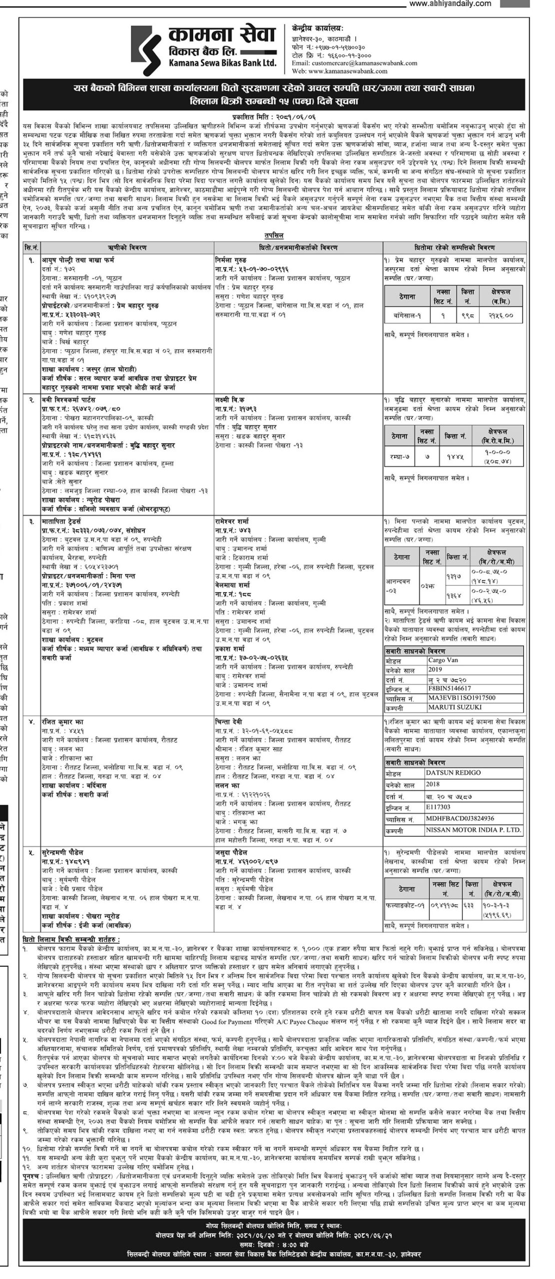 काठमाडौँ ।कामना सेवा विकास बैंकले विभिन्न शाखाहरूमा धितो सुरक्षणमा रहेका अचल सम्पत्तिहरू (घर/जग्गा तथा सवारी साधन) लिलाम बिक्री गर्न १५ दिने सार्वजनिक सूचना जारी गरेको छ। बैंकले २०८१ असोज ६ गते प्रकाशित सूचनामा, ऋण लिएको सम्झौताअनुसार रकम चुक्ता नगरेका ऋणीहरूमाथि बारम्बार मौखिक र लिखित आग्रह गर्दा पनि कुनै चासो नदेखाएको भन्दै सम्पत्तिहरू लिलाम गर्न प्रक्रिया अगाडि बढाएको हो।