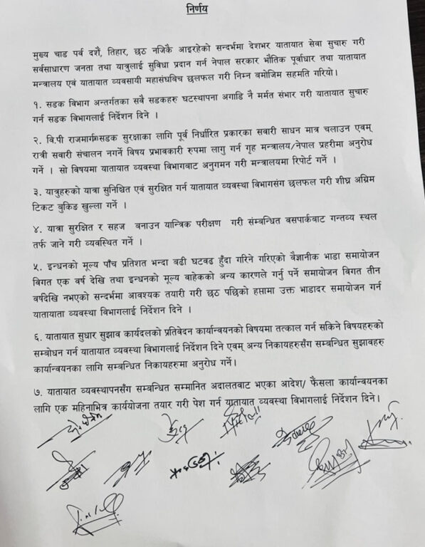 भौतिक पूर्वाधार तथा यातायातमन्त्री देवेन्द्र दाहालको अध्यक्षतामा बसेको बैठकले व्यवसायीका मागका सम्बन्धमा सातबुँदे निर्णय गरेको छ ।