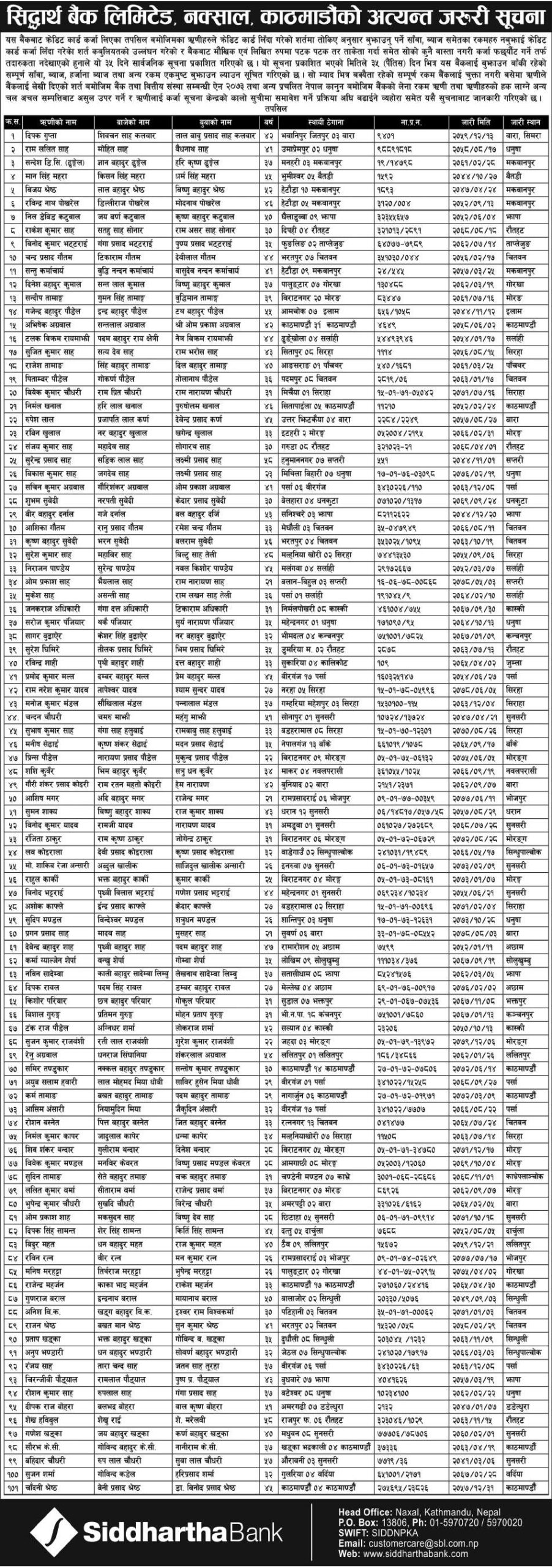 काठमाडौँ । सिद्धार्थ बैंकले क्रेडिट कार्डमा कर्जा लिएर ऋण नतिर्ने १०१ जनाको नाम सार्वजनिक गरेको छ । बैंकले आज राष्ट्रिय प्रत्रिकामा नै नाम सार्वजनिक गरेको हो ।