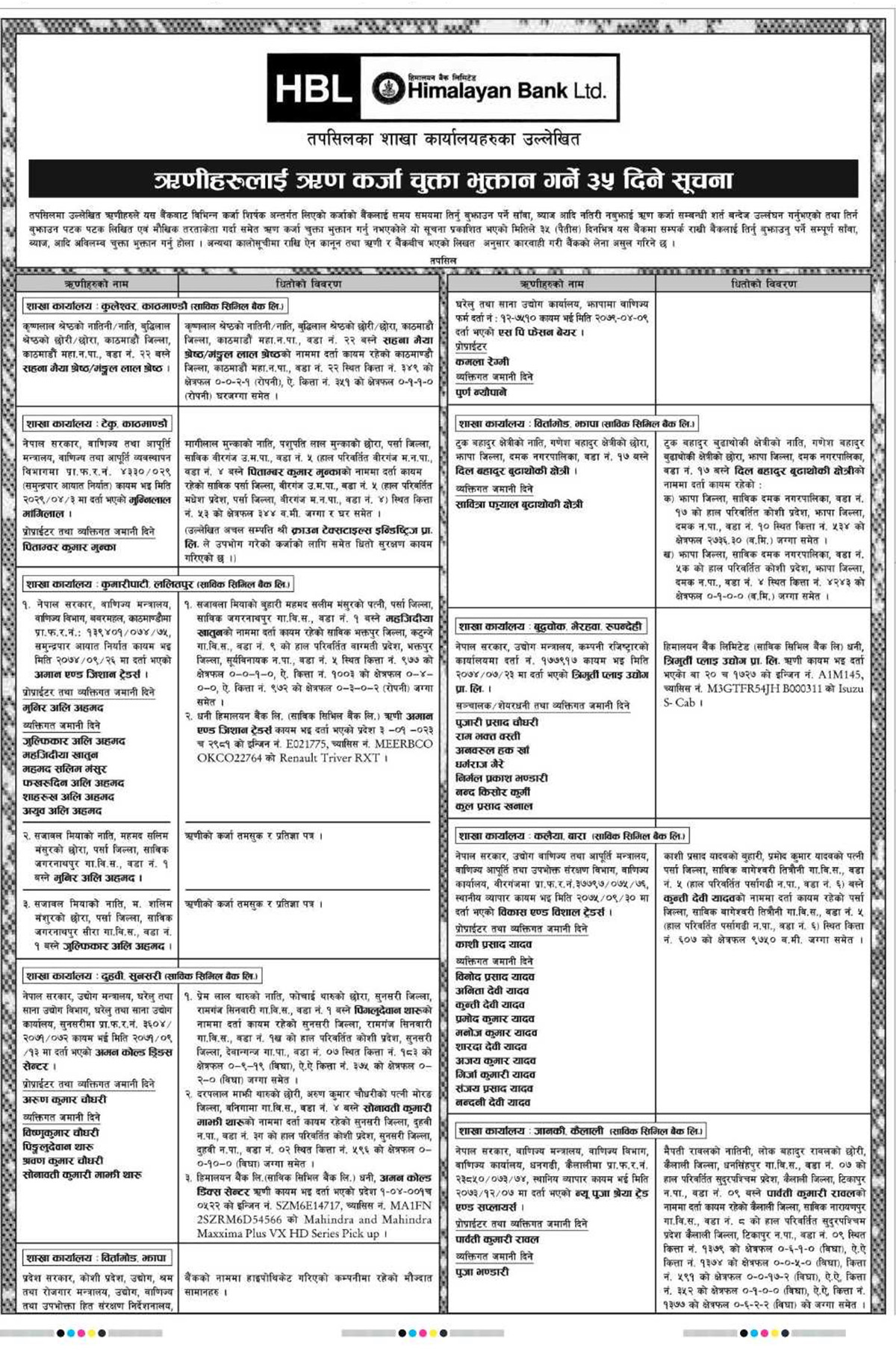 हिमालयन बैंकद्वारा ऋण नतिर्नेलाई ३५ दिने ताकेताः बक्यौता नतिरे कारवाहीको चेतावनी
