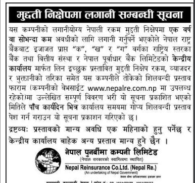यस प्रस्तावको मान्य अवधि एक महिना हुने र केन्द्रीय कार्यालय बाहेक अन्य कार्यालयहरूमा पेश गरिएका प्रस्तावहरू मान्य नहुने सूचनामा स्पष्ट रूपमा उल्लेख गरिएको छ। नेपाल पुनर्बीमा कम्पनी नेपाल सरकारको स्वामित्वमा रहेको कम्पनी हो।
