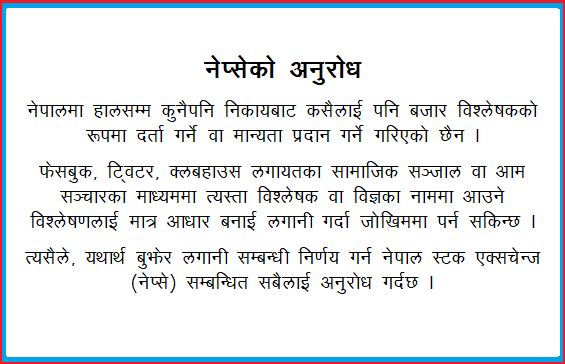 नेप्सेले फेसबुक, ट्विटर, क्लब हाउसजस्ता सामाजिक सञ्जाल तथा अन्य सञ्चार माध्यमहरूमा आउने विश्लेषणलाई सत्यताको आधारमा परीक्षण नगरीकन लगानी गर्दा जोखिम उत्पन्न हुन सक्ने चेतावनी दिएको छ।
