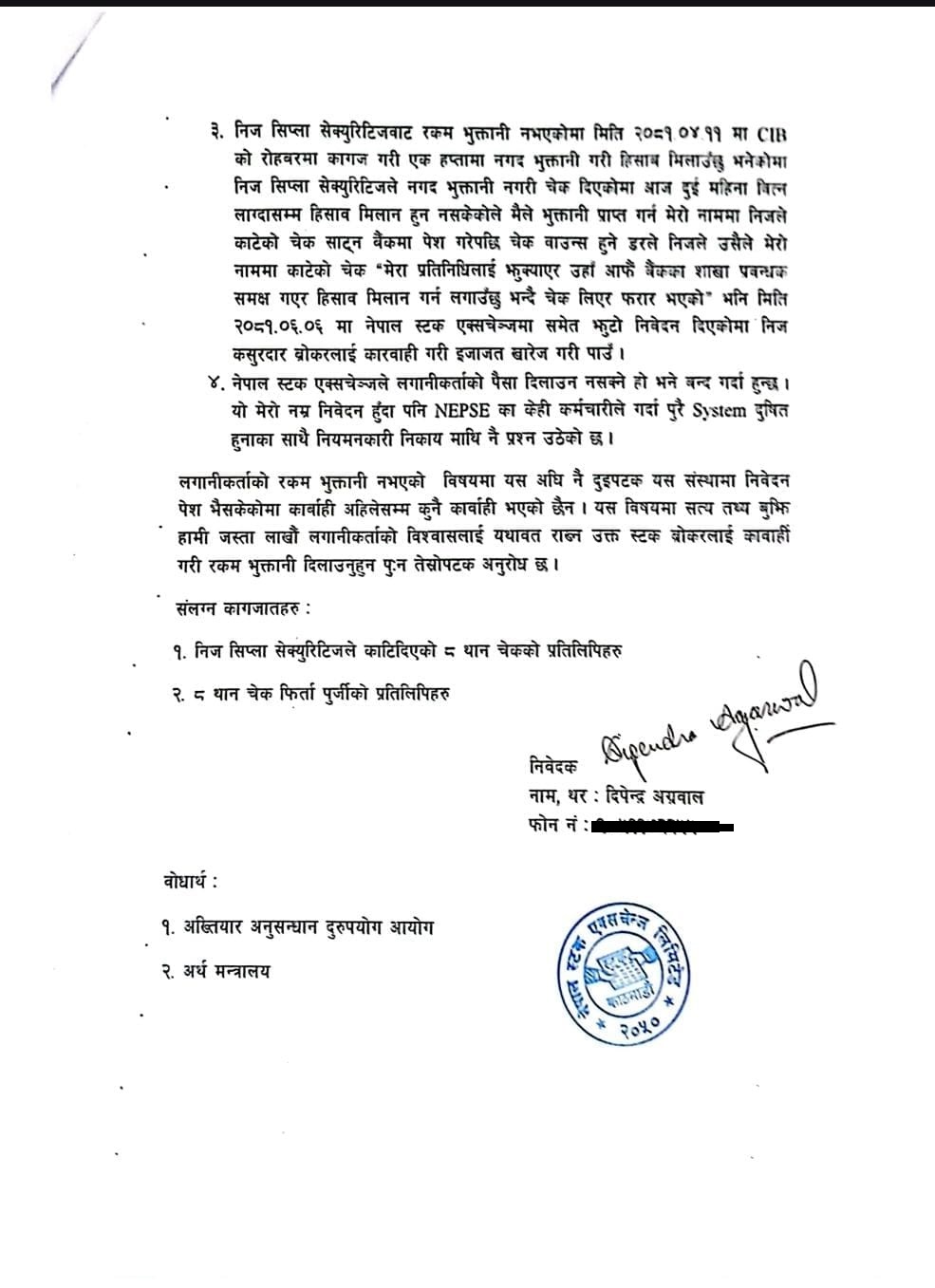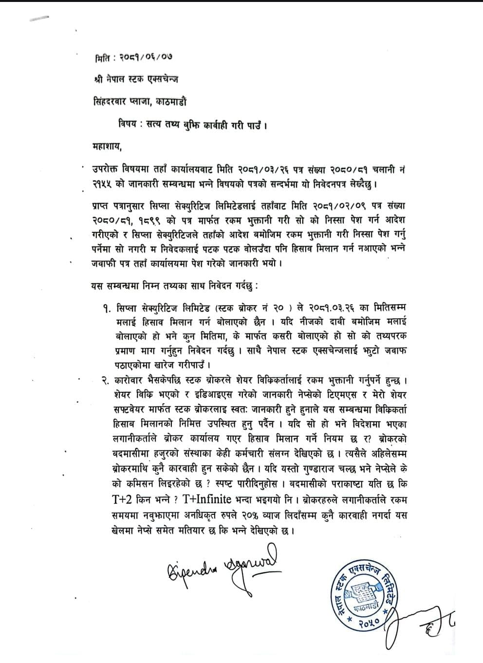 अग्रवालले सिप्ला सेक्युरिटिजले २०८१ जेठ ९ मा रकम भुक्तानी गरी निस्सा पेश गर्न आदेश दिँदा पनि आफ्नो जिम्मेवारी पूरा नगरेको दाबी गरेका छन्। साथै, उनले ब्रोकरले आफूलाई पटक–पटक हिसाब मिलानका लागि बोलाएको भनेर नेप्सेलाई जानकारी गराए पनि कुनै मितिमा वा माध्यमबाट बोलाइएको छैन भन्ने विषयमा स्पष्ट प्रमाण पेश गर्न माग गरेका छन्।