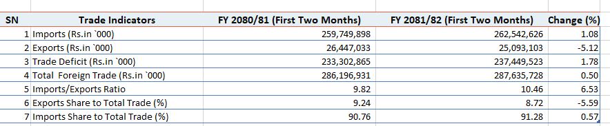 यता, व्यापार घाटा १.७८ प्रतिशतले बढेको छ । गत आर्थिक वर्षको २ महिनामा २ खर्ब ३३ अर्ब ३० करोड २८ लाख रुपैयाँ व्यापार घाटा हुँदा चालु आर्थिक वर्षको सोही अवधिमा २ खर्ब ३७ अर्ब ४४ करोड ९५ लाख करोड रुपैयाँ पुगेको हो ।