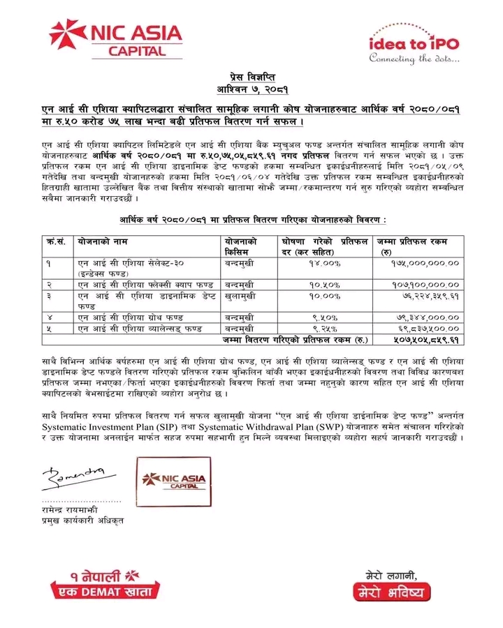 एनआईसी एशिया क्यापिटलद्धारा संचालित सामूहिक लगानी कोष योजनाहरुबाट ५० करोड ७५ लाख प्रतिफल वितरण गर्न