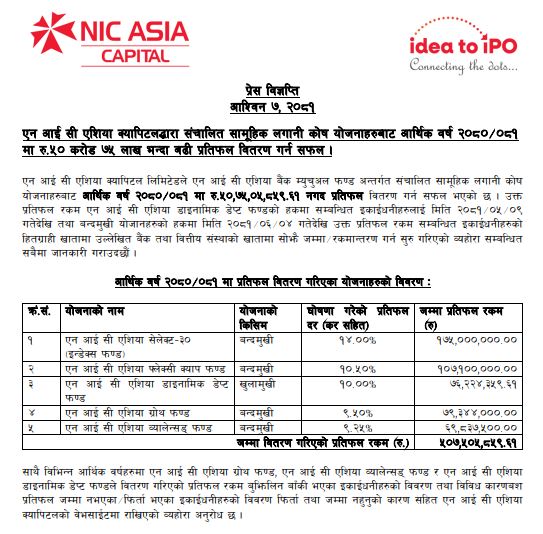 एनआइसी एसिया सेलेक्ट ३० का इकाइधनीहरुलाई गत वर्षको नाफाबाट करसहित १४ प्रतिशत, फ्लेक्सी क्याप फन्डको करसहित १०।५० प्रतिशत, ग्रोथ फन्डको करसहित ९.५० प्रतिशत र ब्यालेन्स्ड फन्डको करसहित ९।२५ प्रतिशत प्रतिफल वितरण गरेको हो ।