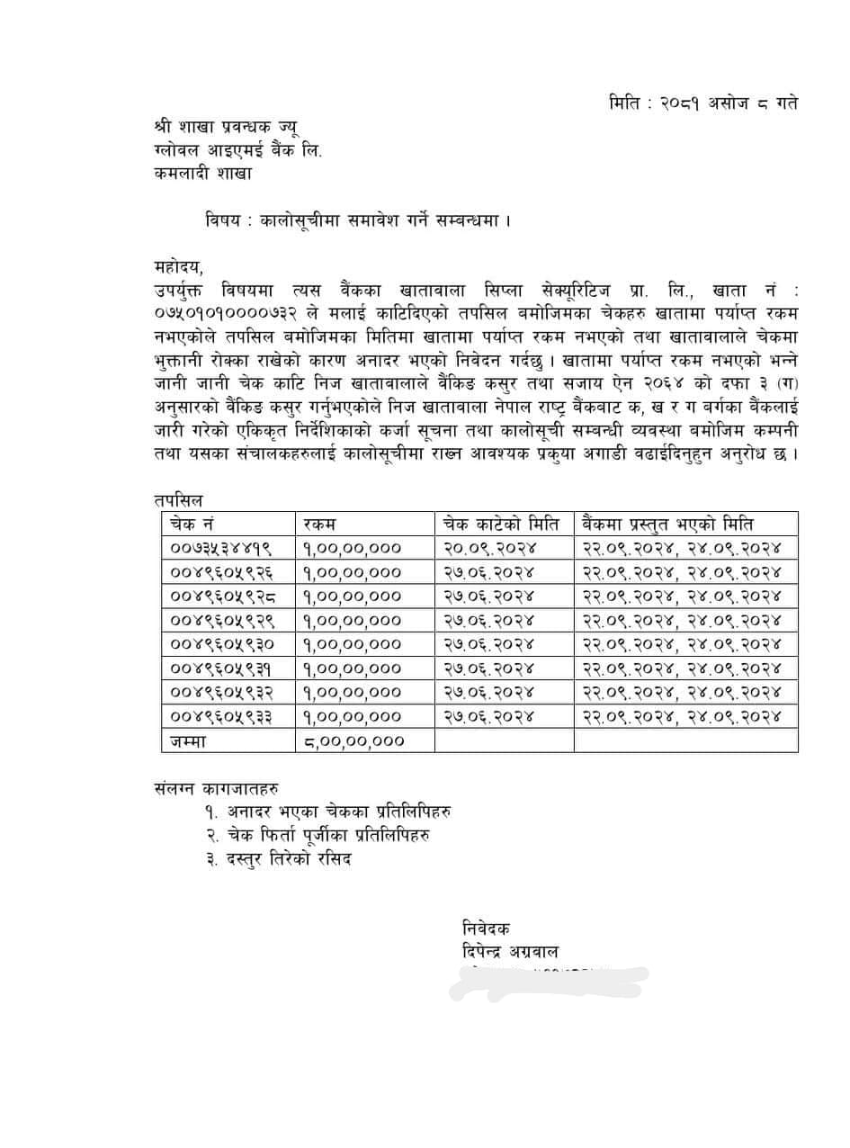 नेप्सेबाट शेयर ब्रोकर नं २० मा अनुमति प्राप्त सिप्लाबाट हिजो एक करोड भन्दा बढिको कारोबार भएको छ । लगानीकर्ता दिपेन्द्र अग्रवालले सिप्ला सेक्युरिटिजले दिएको आठ करोड रुपैयाँ बराबरको चेक दुई पटक बाउन्स भइसकेको छ । हिजै अग्रवालले ग्लोबल आइएमई बैंकमा कालोसूचिमा सूचिकरण गर्न निवेदन दर्ता गरिसकेका छन् ।