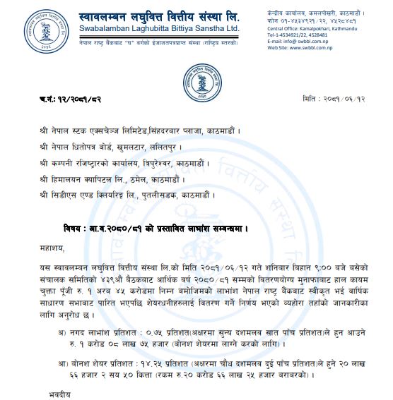 स्वावलम्बन लघुवित्तद्वारा लाभांश घोषणा, कति दिने भयो बोनस र नगद ?
