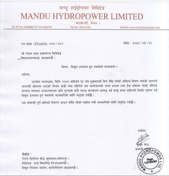 असोज ११ गतेदेखि परेको अबिरल वर्षाका कारणले बागमती खोलामा आएको भिषण बाढी तथा पहिरोले आयोजनाको पावर हाउस तथा हेड वक्र्समा भौतिक संरचना लगायतका उपकरण क्षति पुगेका कारण विद्युत उत्पादन बन्द भएको कम्पनीले जनाएको छ ।
