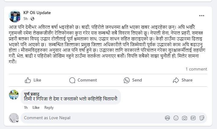 केहीले सामाजिक सञ्जालमा ओली अमेरिकाबाटै मौसमको भविष्यवाणी गर्दै स्वदेशमा विवत्ती झेलिरहेका नेपालीलाई जिस्काइरहेको भन्दै टिप्पणी गरेका छन् । ओली भने अमेरिकाबाट फेसबुक स्टाटस लेख्दै फेरि पनि जोखिम रहेको भन्दै सचेत रहन र उद्धारका लागि सरकारले परिचालन गरेका सुरक्षाकर्मीलाई सहयोग गर्न भन्दै आग्रह गरेका छन् ।