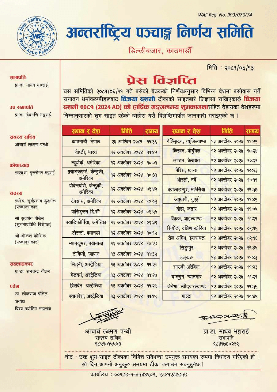 विजयादशमीको टीकाको साइत सार्वजनिक गरेको छ । समितिले आइतबार एक विज्ञप्ति जारी गर्दै टीकाको ‘अन्तर्राष्ट्रिय साइत सार्वजनिक गरेको हो ।