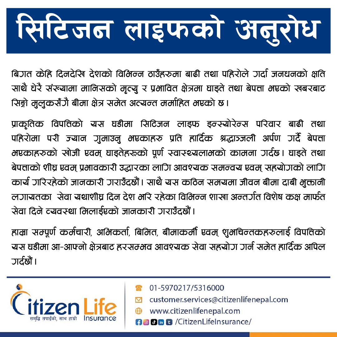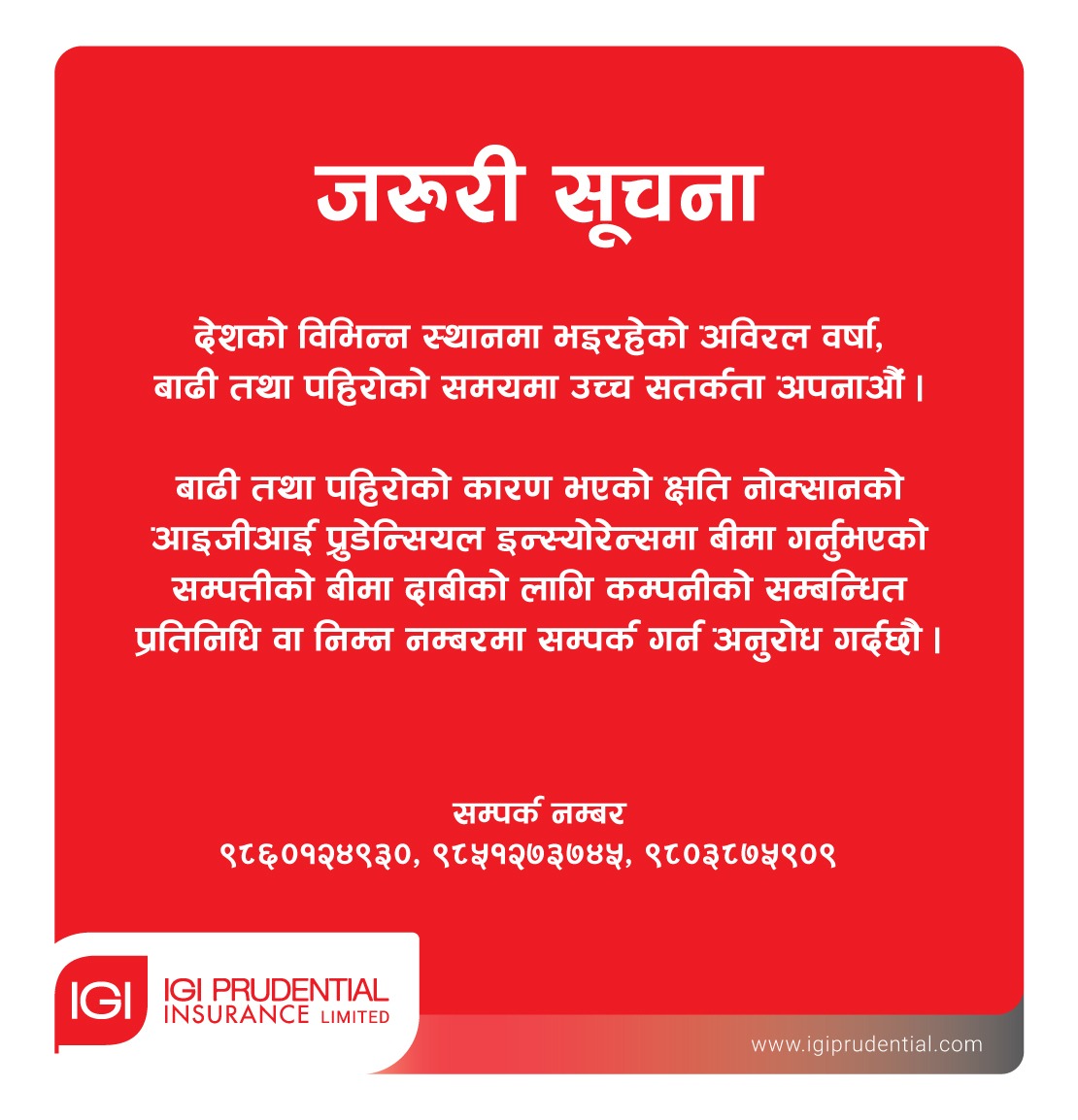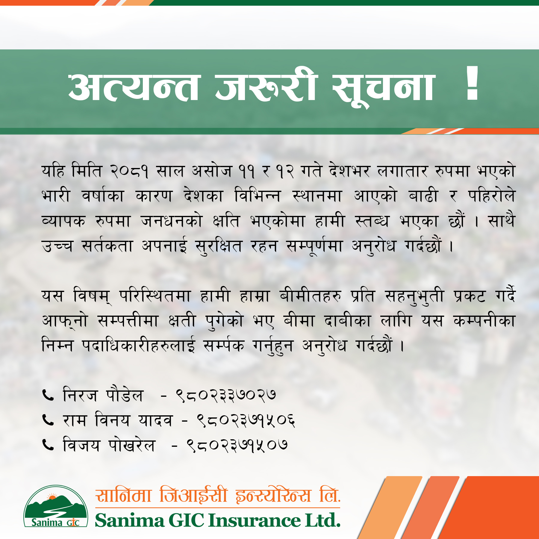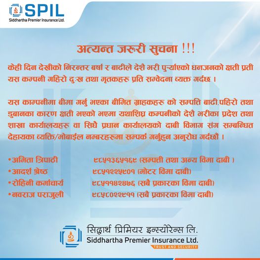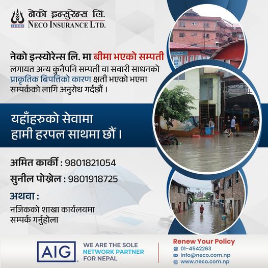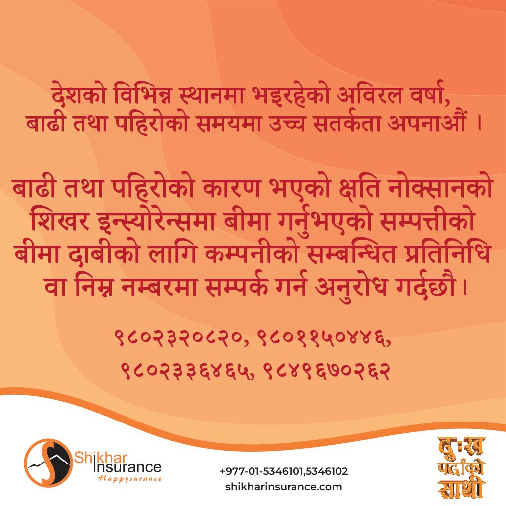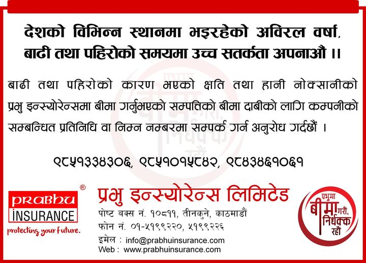 काठमाडौँ । पछिल्लो केहि दिनदेखि परेको अविरल वर्षाले नेपालमा व्यापक क्षति पुर्याएको छ। यसबाट प्रभावित व्यक्तिहरूलाई बीमा दाबी गर्नको लागि विभिन्न बीमा कम्पनीहरूले सूचना जारी गर्दै आव्हान गरेका छन्। बीमा गरिएको कुनै पनि सम्पत्तिमा क्षति पुगेको भए ग्राहकहरूले फोनमार्फत (हटलाइन) या कम्पनीको कार्यालयमा गएर जानकारी दिन सक्छन्।