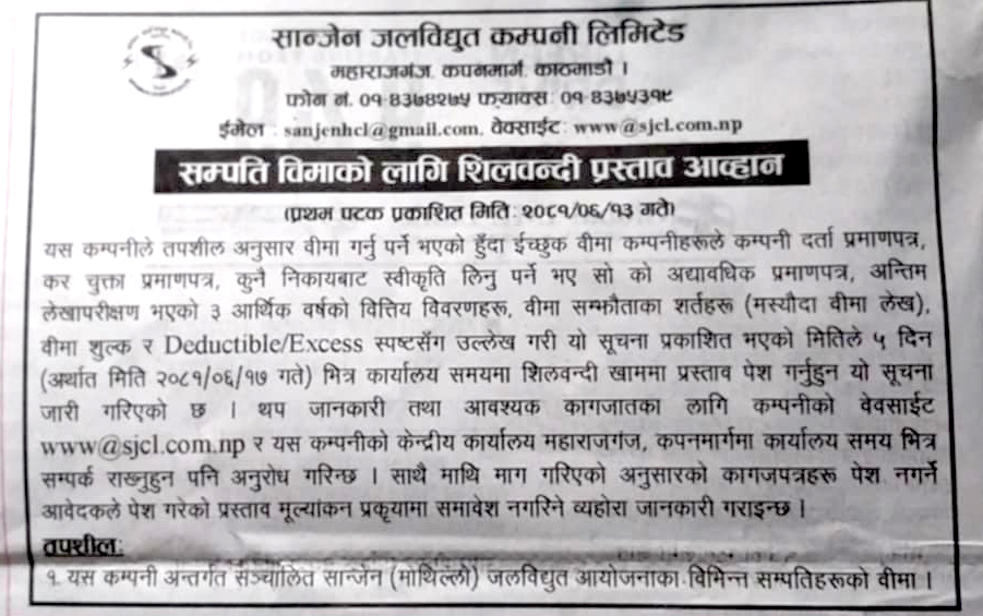 काठमाडौँ । सान्जेन जलविद्युत कम्पनी लिमिटेडले सम्पति बीमाको लागि बीमा कम्पनीहरुलाई शिलबन्दी प्रस्ताव गर्न आह्वान गरेको छ । कम्पनीले सोमबार एक सार्वजनिक सूचना प्रकाशित गर्दै बीमा कम्पनीहरुलाई सम्पत्ति बीमाको लागि प्रस्ताव पेश गर्न आग्रह गरेको हो ।