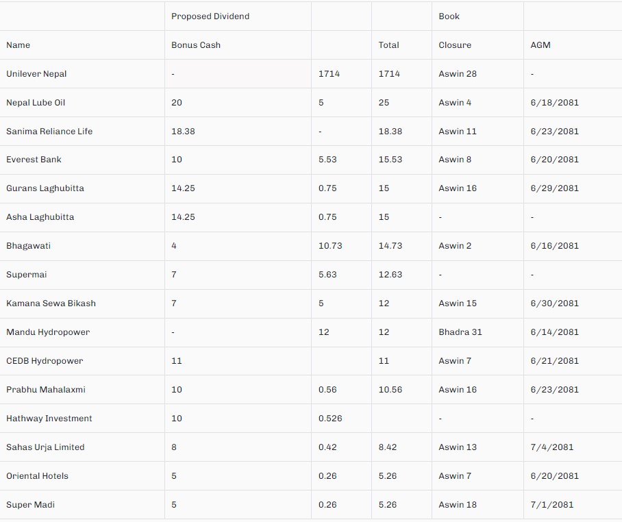 हालसम्म लाभांश घोषणा गर्ने मध्ये युनिलिभर नेपाल लिमिटेडले सबैभन्दा धेरै लाभांश घोषणा गरेको छ । गत वर्षको नाफाबाट यस कम्पनीले सेयरधनीलाई कर सहित प्रतिकित्ता १७ सय १४ रुपैयाँ नगद लाभांश घोषणा गरेको छ । बिमा कम्पनीहरुले आर्थिक वर्ष २०७९–८० सम्मको सञ्चित नाफाबाट सेयरधनीलाई लाभांश घोषणा गरेका हुन् भने अन्य कम्पनीहरुले आर्थिक वर्ष २०८०–८१ सम्मको सञ्चित नाफाबाट सेयरधनीलाई लाभांश घोषणा गरेका हुन् ।