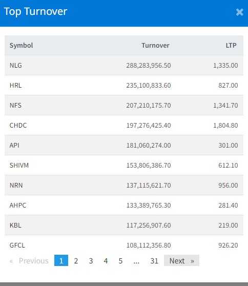 त्यस्तै, नेपाल फाइनान्स, सिईडिबी हाईड्रोपावर, अपी पावर, शिवम सिमेन्टस, अरुण भ्याली, एनआरएन इन्फ्रास्क्चर, कुमारी बैंक र गुडबिल फाइनान्सको सर्वाधिक कारोबार भएको छ।