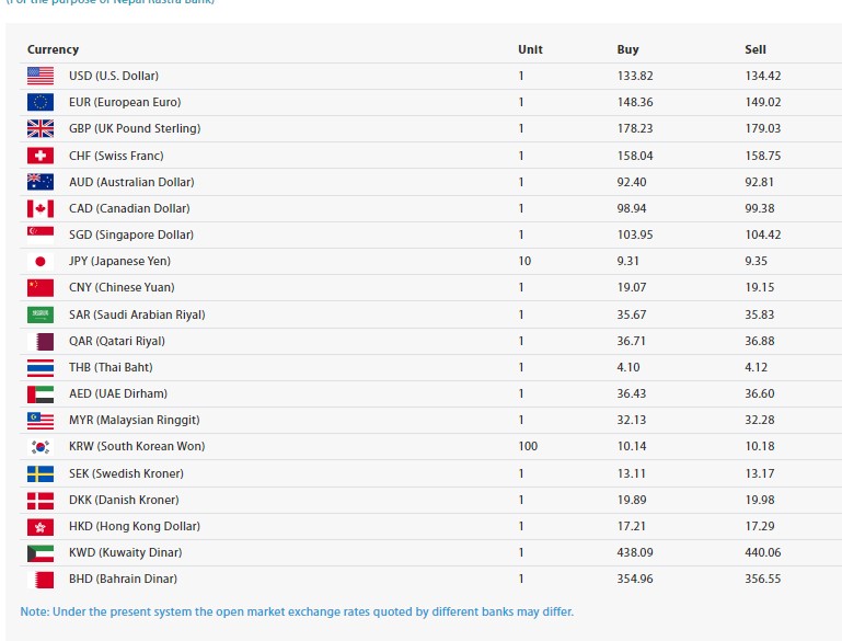 राष्ट्र बैंकका अनुसार आज १ युरोको बिक्रीदर १४९ रुपैयाँ२ पैसा रहेको छ भने खरिददर १४८ रुपैयाँ ३६ पैसा रहेको छ । बेलायती पाउन्ड १ को बिक्रीदर १७९ रुपैयाँ ३ पैसा खरिददर १७८ रुपैयाँ २३ पैसा रहेको राष्ट्र बैंकले जनाएको छ । जापानिज येनको बिक्रीदर ९ रुपैयाँ ३५ पैसा र खरिददर ९ रुपैयाँ ३१ पैसा छ ।