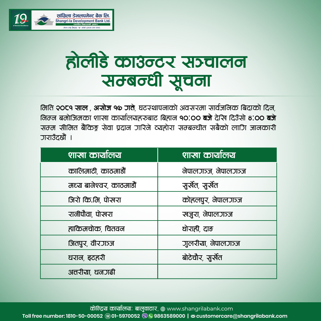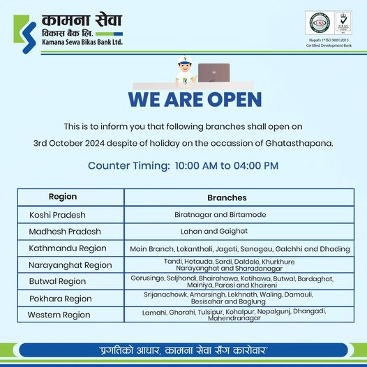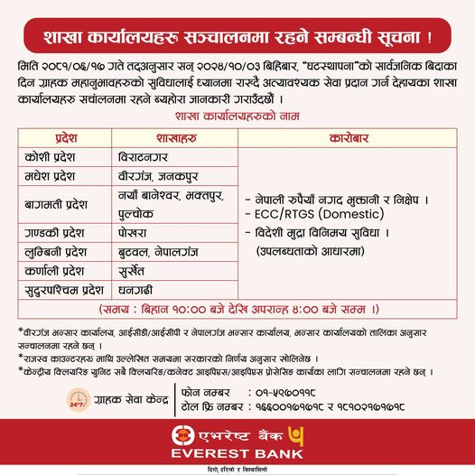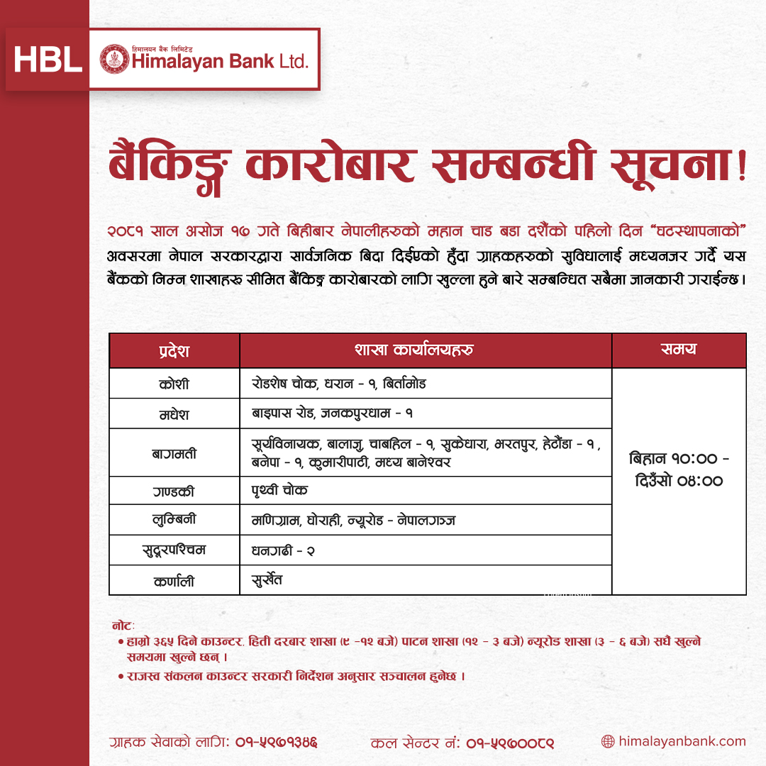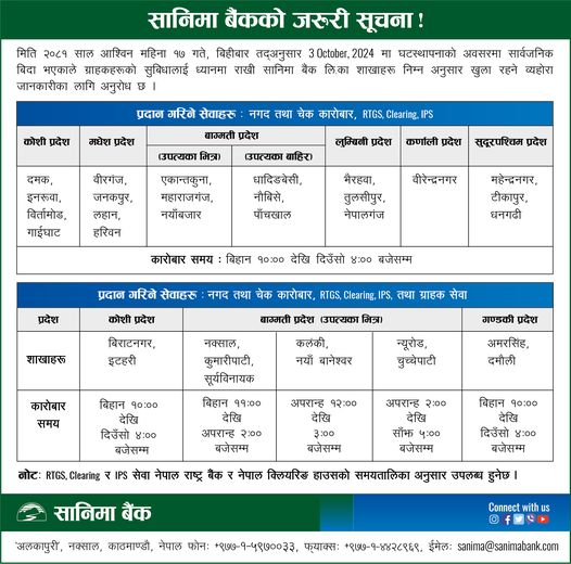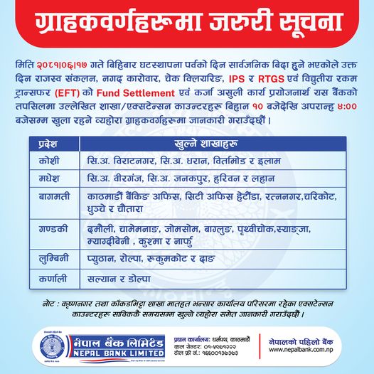 दशैंको मुखमा आम सर्वसाधारणलाई बैंकिङ्क कारोबारको धेरै आवश्यकता हुने भएकाले बैंकहरुले केहि शाखा खुला राखेर सेवा दिन लागेको छ ।
