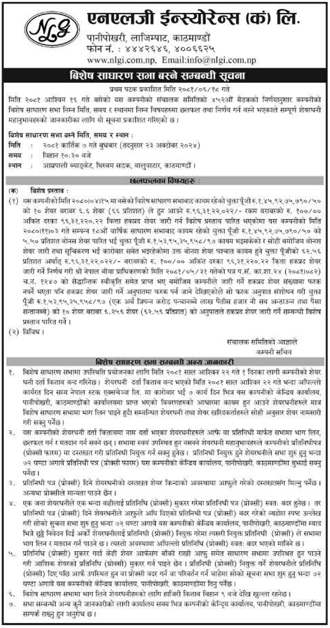 नेपाल धितोपत्र बोर्डले गत शुक्रबार एनएलजी इन्स्योरेन्स कम्पनीले निष्काशन गर्न लागेको १००ः६२.५ रेसियोको हकप्रद स्वीकृत गरेपश्चात कम्पनीले अन्य प्रक्रिया अन्तर्गत विशेष साधारण सभा आयोजना गरेको हो ।