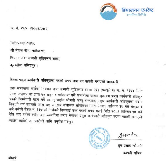 हिमालयन एभरेष्ट इन्स्योरेन्सकी सीईओ श्रेष्ठको पद वहाली