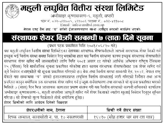 सो शेयर किन्न इच्छुकले आवश्यक पर्ने कागजात सहित ७ दिनभित्र कम्पनी सचिवको कार्यालय अग्नीसाइर कृष्णासवरण–६, महुली सप्तरीमा आफूले किन्न चाहेको कित्ता विवरण खुलाई निवेदन दिनु पर्नेछ । शेयरको बिक्री मूल्य भने बिक्रेताले ताकेबमोजिम हुने सूचनामा उल्लेख गरिएको छ ।
