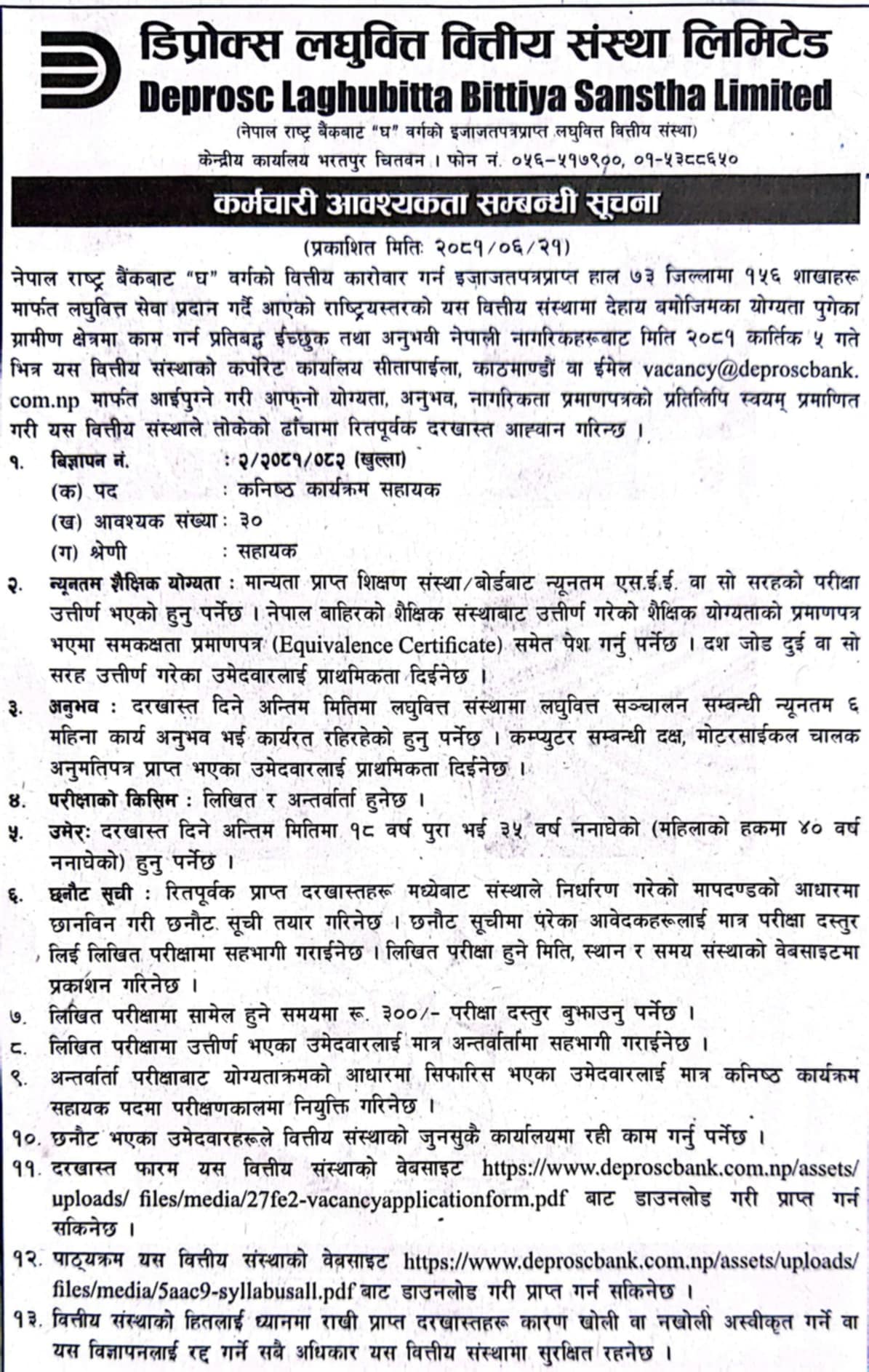 डिप्रोक्स लघुवित्तमा ३० जना कर्मचारी माग, कति चाहिन्छ योग्यता?