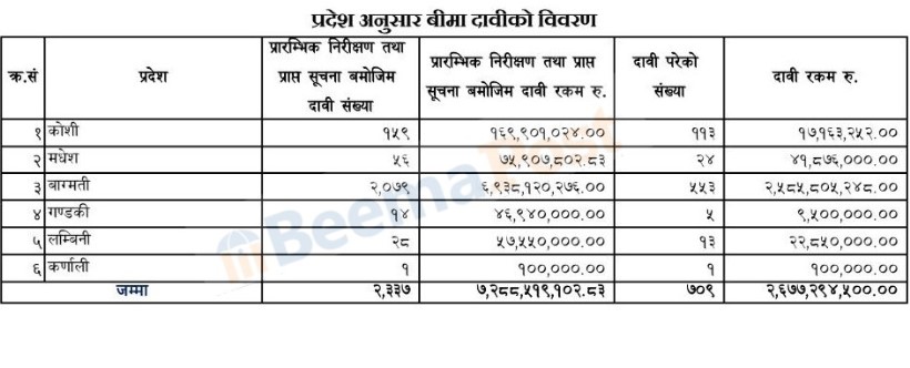 त्यस्तै, लुम्बिनीबाट २८ वटा बीमा वापत ५ करोड ७५ लाख रुपैयाँ, गण्डकी प्रदेशबाट १४ वटा दाबी वापत ४ करोड ६९ लाख रुपैयाँ र कर्णालीबाट १ वटा बीमा दाबी वापत १ लाख रुपैयाँ मात्रै दाबी पर्ने आंकलन गरेको छ।