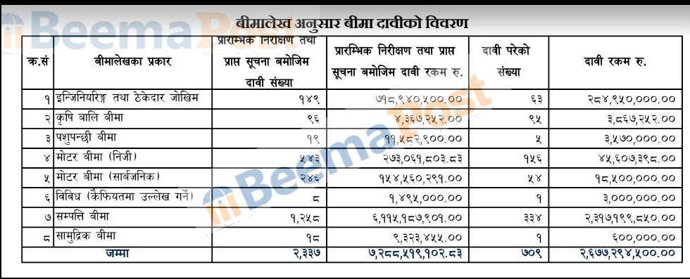 बीमा प्राधिकरणको तथ्यांक अनुसार सम्पत्ति बीमाको दाबी सबैभन्दा बढी हुने अनुमान गरिएको छ।