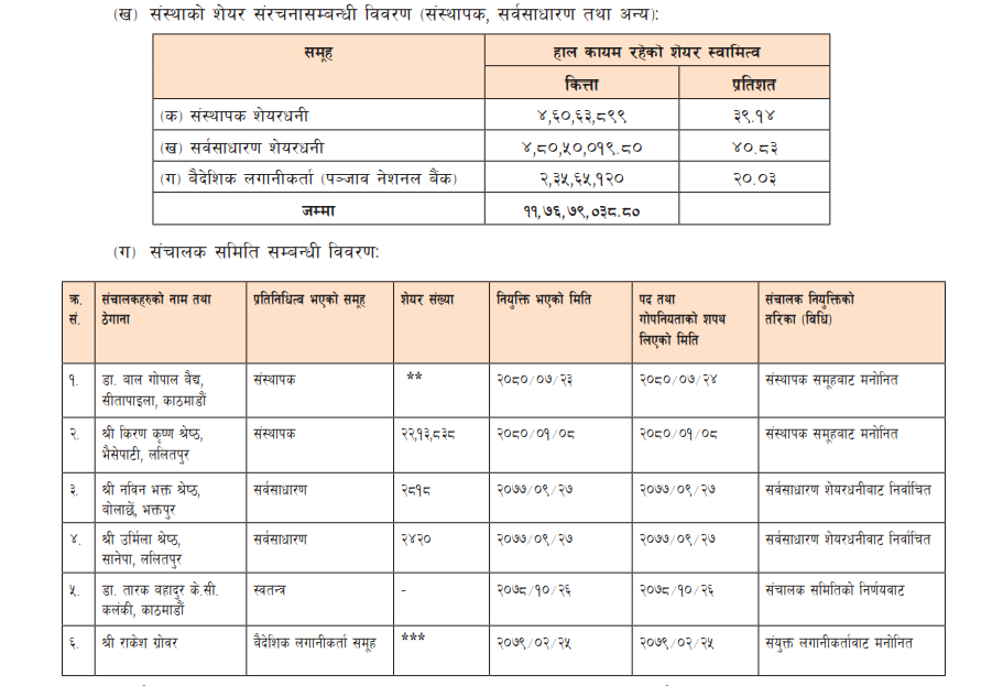 त्यस्तै, संस्थापक समुहको ३९.१४ प्रतिशतले चार करोड ६० लाख ६३ हजार कित्ता र बैदेशिक लगानीकर्ता (पञ्जाव नेशनल बैंक) को २०.०३ प्रतिशतले दुई करोड ३५ लाख ६५ हजार कित्ता शेयर रहेको छ ।